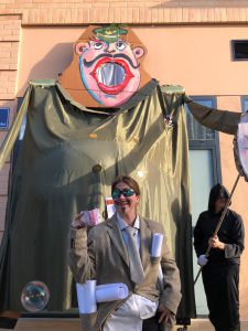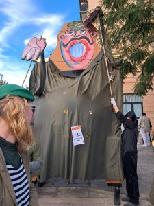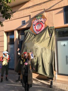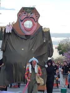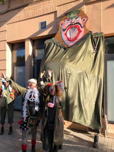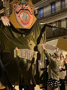 Sort que en arribar a l’escenari final de la cercavila, les pallasses del Jejejército del MOC van aconseguir el seu objectiu i van tombar, van fer caure el monstre de la guerra estirant cadascuna pel seu costat, com a la cançó de Lluís Lllach… 😉