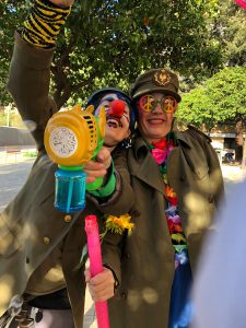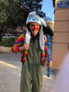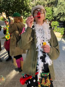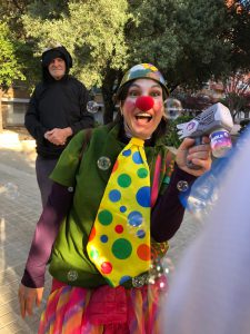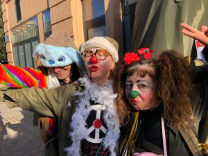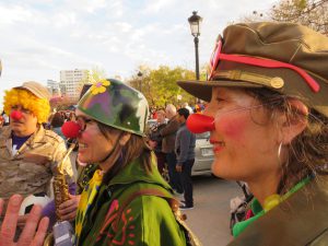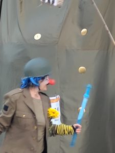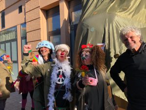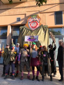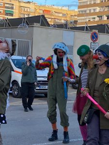 Així, les pallasses van haver d’emprarse a fons amb el seu habitual armament de llança-bombolles, canons de confeti, ràfegues de saxofó, càrregues amb plumers etc, per evitar l’avanç del gegant del militarisme i l’executiva capitalista de torn li donara menjar la salut, l’amor, l’educació, la natura, les arts, la igualtat, la justícia, els drets i la pau! Tot el que fa la vida bona. Perquè el gegant del rearmament s’alimenta de tot això i clar, el que defeca ja s’ho podeu imaginar: armes i més armes, mes mortals, mes destructives, odi i guerra global.