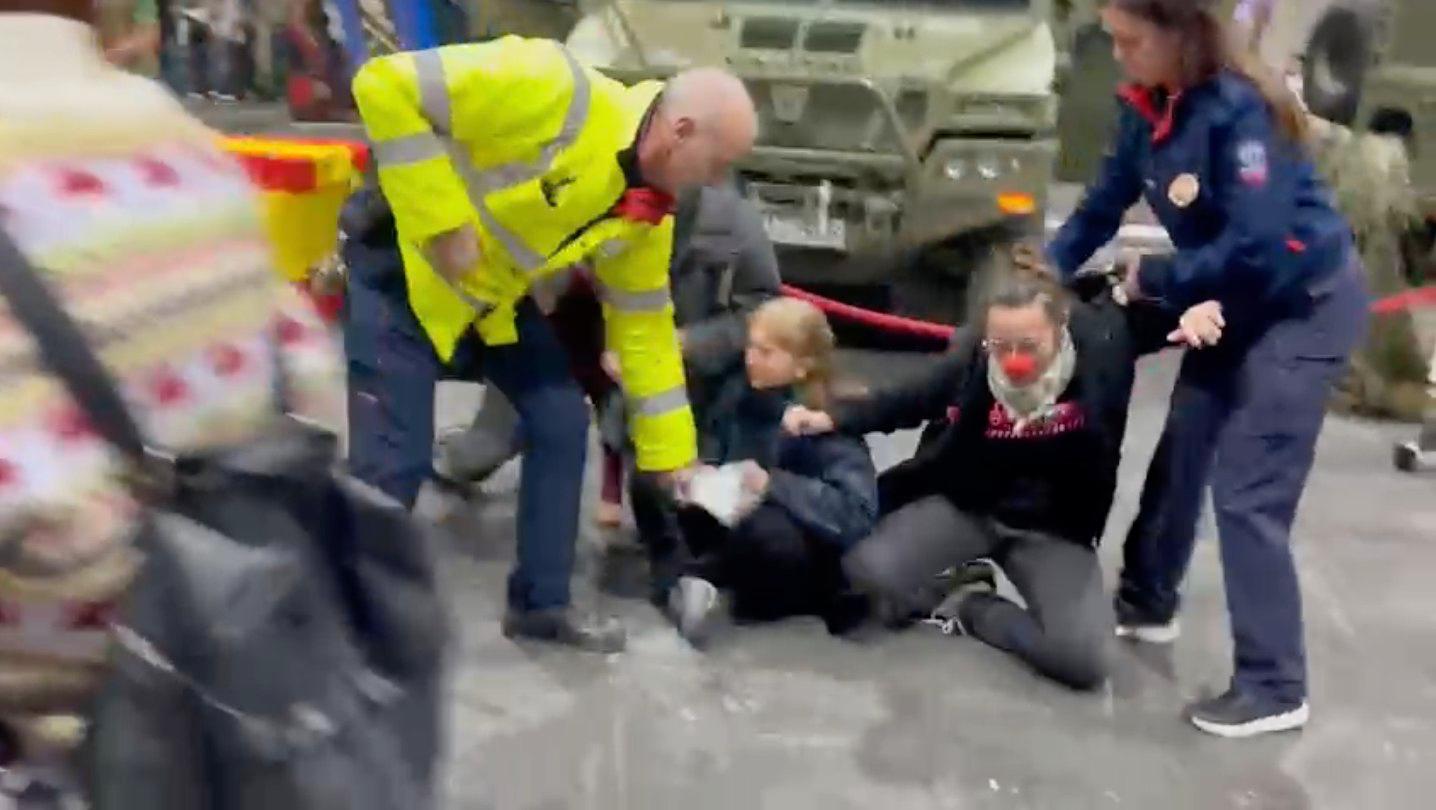 El dia de la nostra acció a Expojove, divendres 25 de desembre al voltant de les 11:30, vam ser interceptades per la Policia Nacional, que va actuar de manera desproporcionada, humiliant i intimidatòria. Aparentment seguint ordres de la cap de seguretat de Fira València, que és una entitat privada, vam ser escorcollats en la via pública, a la vista del públic que esperava per entrar a Expojove, amb tocaments de genitals inclosos, i se’ns va confiscar sense més explicacions materials que pel que sembla són amenaces per a la seguretat ciutadana, com ara cartells de color rosa amb lemes pacifistes, fulles informatives, nassos de pallasso, confeti, i fins i tot un simple rotllo de paper higiènic. Tot això amb un desplegament absolutament excessiu: dos furgons de la Policia Nacional i diverses patrulles de la Policia Local de València, per controlar una acció de cinc persones, noviolenta, simbòlica i clarament identificada com a protesta pacífica antimilitarista.